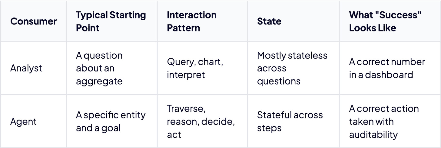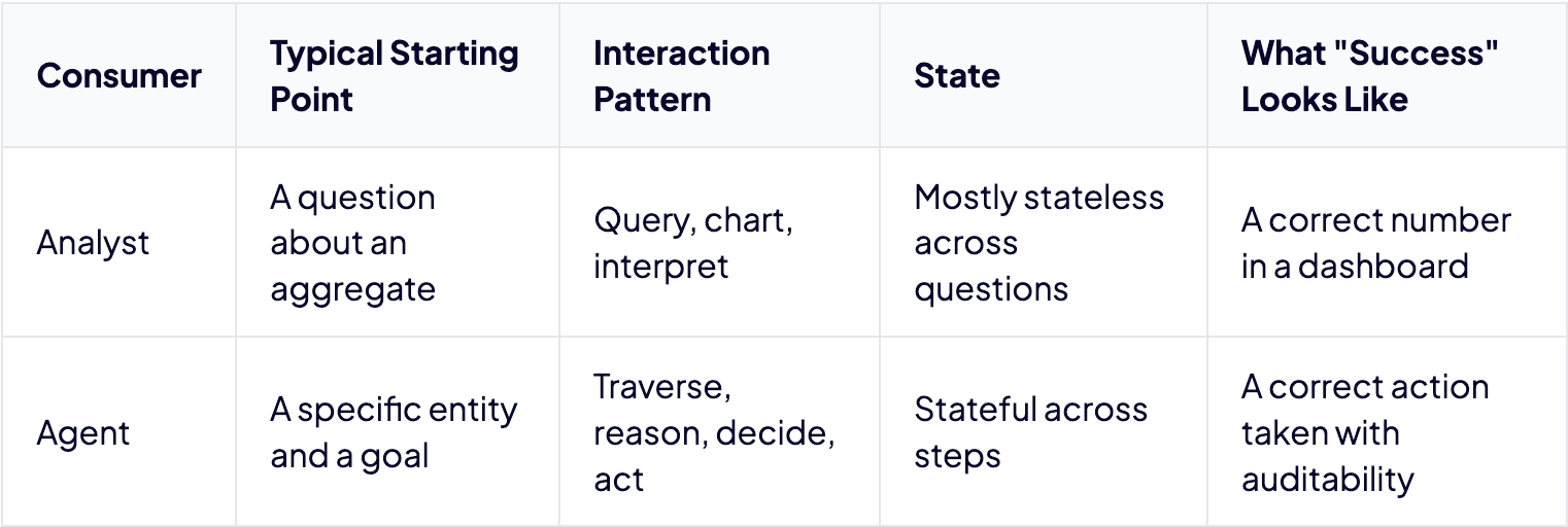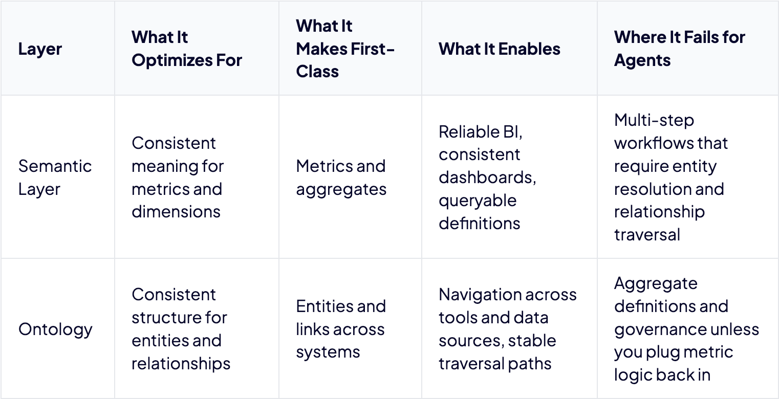 Semantic layers were built for analysts asking aggregate questions in BI. Agents need to resolve entities, follow relationships, and take actions across systems. That’s a different workload entirely, and no amount of metric governance was designed to support it.